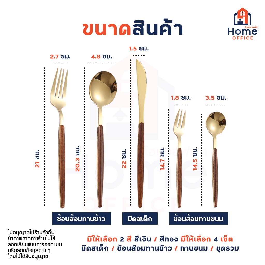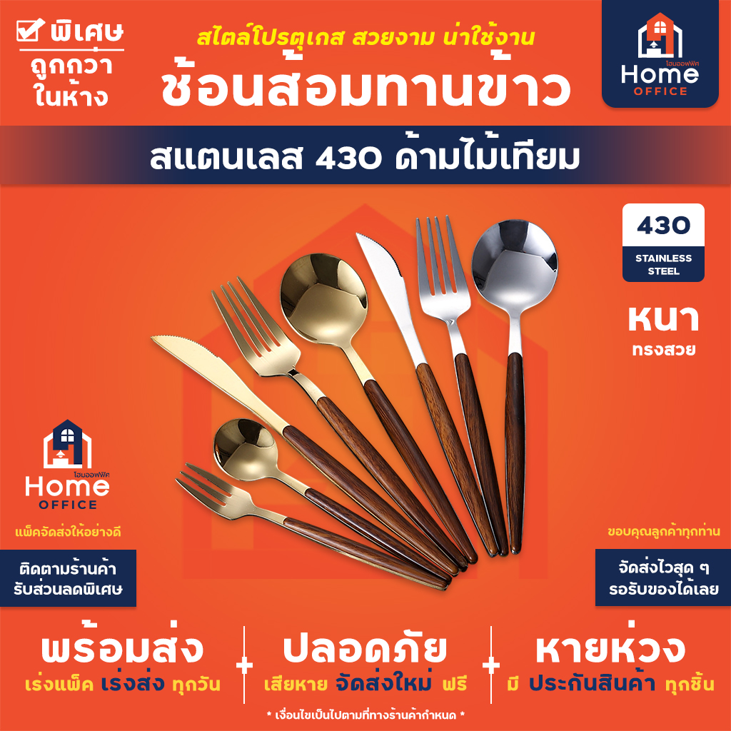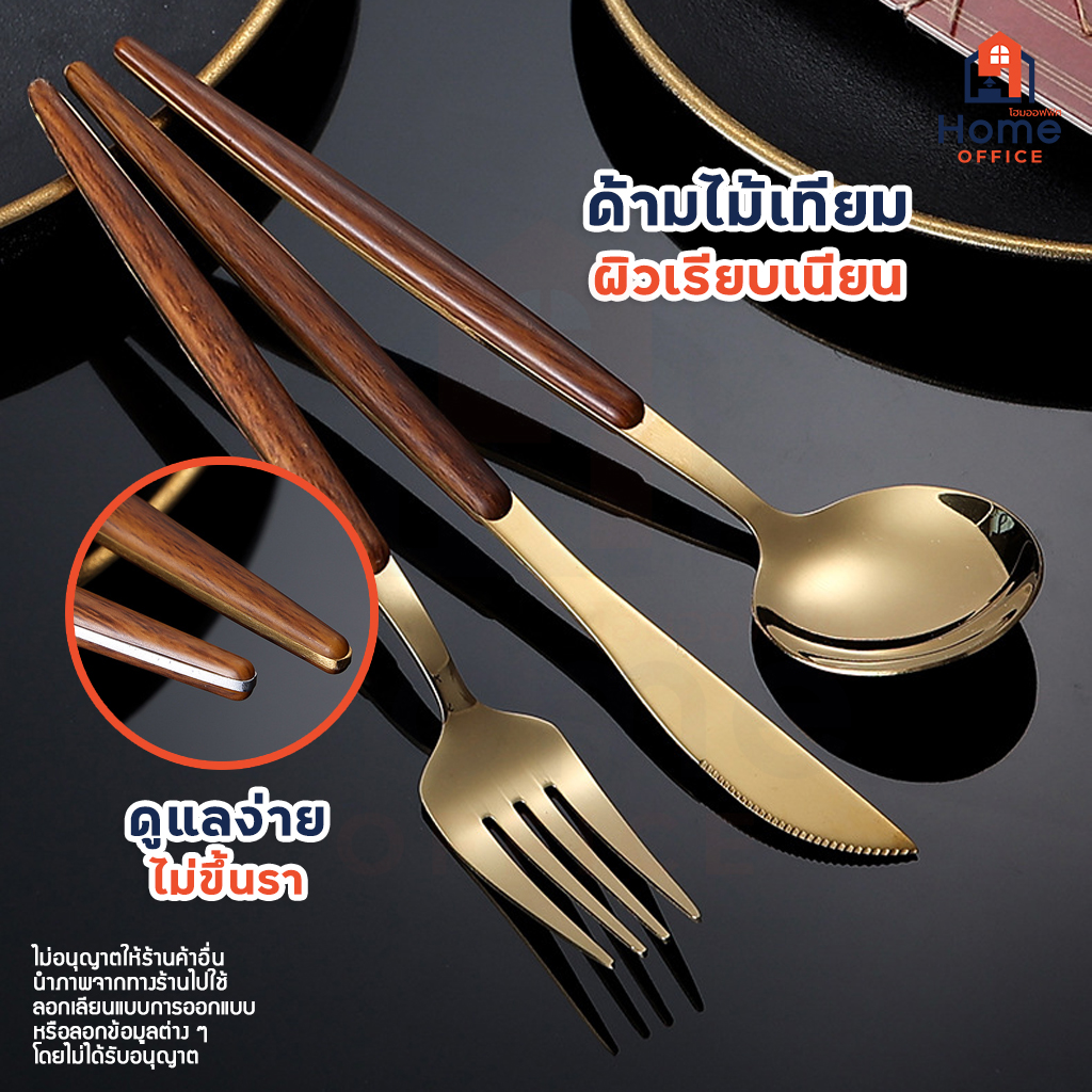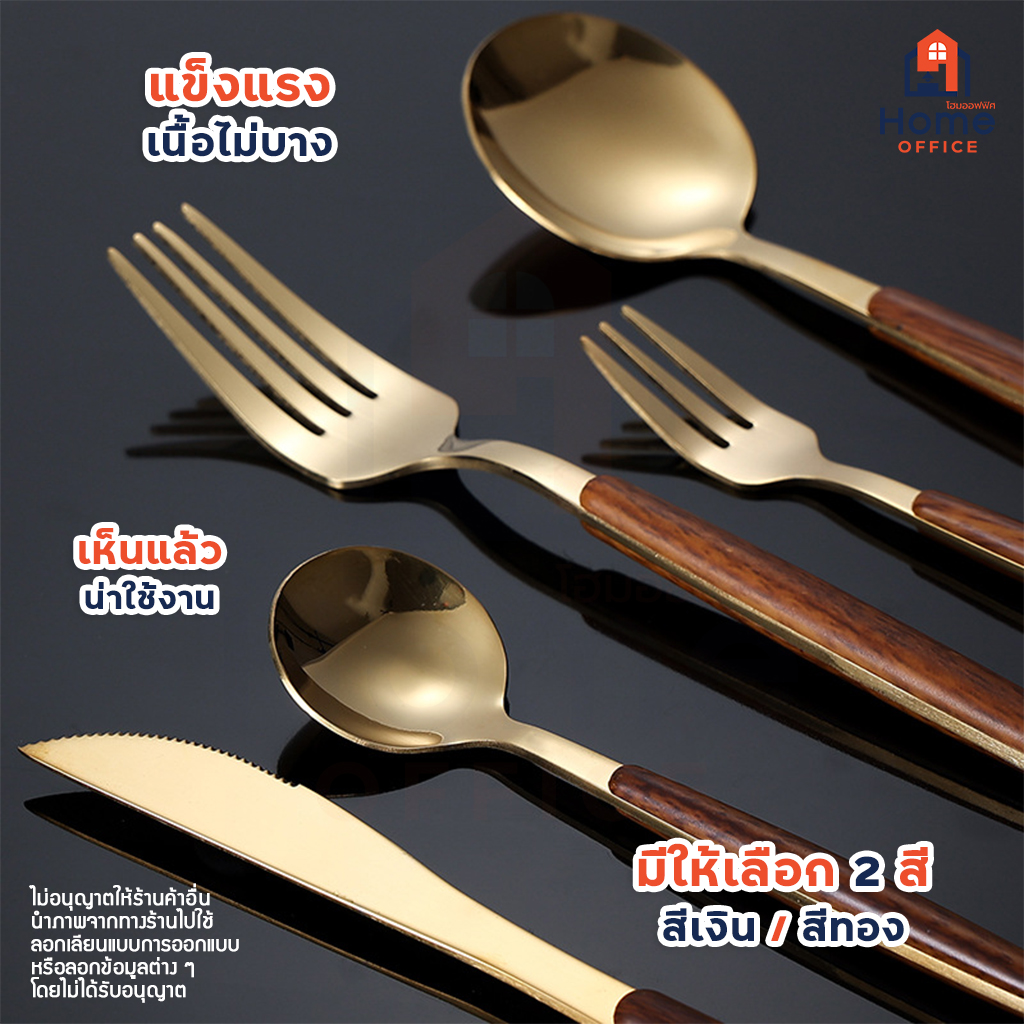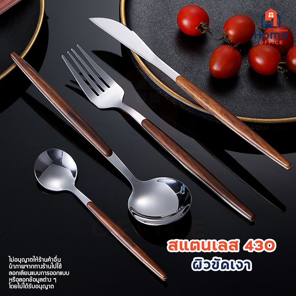 Home Office ช้อนส้อมทานข้าว (ด้ามไม้เทียม) สแตนเลส 430 สไตล์โปรตุเกส ช้อนทานข้าว ส้อมทานข้าว ด้ามจับไม้ ทรงสวย มีดสเต็ก